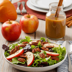 A: This salad captures the essence of fall with crisp, juicy apples and crunchy pecans, evoking the warm, cozy flavors of the season. The addition of a spiced dressing-with notes of cinnamon, nutmeg, and a touch of maple syrup-wraps every bite in a harvest-hued hug that’s as comforting as your favorite sweater.