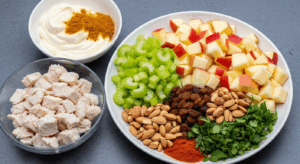 - Prepare Chicken and Fresh Ingredients: Ensure your cooked chicken is shredded into bite-sized pieces for even flavor distribution. Chop celery and apple finely but not so small that texture is lost.