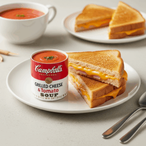 Present your Campbell’s Tomato soup in luminous white bowls alongside the sliced grilled cheese sandwiches arranged on rustic wooden boards or colorful plates.Add a crisp side of mixed greens lightly dressed with lemon vinaigrette to brighten the meal. For visual intrigue, garnish the soup with a swirl of crème fraîche, finely chopped chives, or microgreens. Serve with a classic saltine cracker or a sprinkle of Parmesan crisps for extra texture.