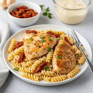 A2: The magic lies in the harmony of sun-dried tomatoes, heavy cream, garlic, parmesan cheese, and fresh herbs like basil or thyme. Juicy chicken breasts add hearty protein, while the creamy sauce clings to every strand of pasta, creating a rich yet balanced flavor profile that feels indulgent without being overwhelming.