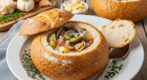 A10: As it combines the best of both worlds-the luxurious creaminess and briny depth of clam chowder with the hearty, satisfying bite of fresh bread. Together, they create a dish that’s comforting yet indulgent, humble yet remarkable-the ultimate cozy culinary hug in a bowl!